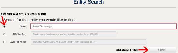 2. You can conduct the search by Filing Number, Applicant/Agent Name, or Registered Name. Let's conduct a sample search by Registered Name. Let's type in "Amkor Technology" in the "Registered Name" field (see the screenshot below for reference).