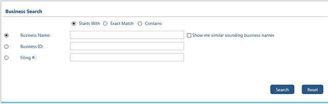 2. The business search form allows you to search by "Business Name", "Business ID" or "Filing Number". You can widen or narrow your search by selecting one of the search options "Starts With", "Exact Match" or "Contains". For this example go ahead and choose "Starts With". We will be searching by "Business Name", so select this option. In the text field type in the name "Presstek". Once you have done this, click the "Search" button as shown in the screenshot below.