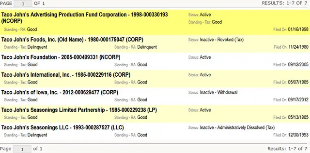 3. When you click the "Search" button it will show you a list of results that matches your search criteria. It displays the entities name, status, current standing and filing date for each business found. Simply click the business name you want to view the details for, as shown in the screenshot below.